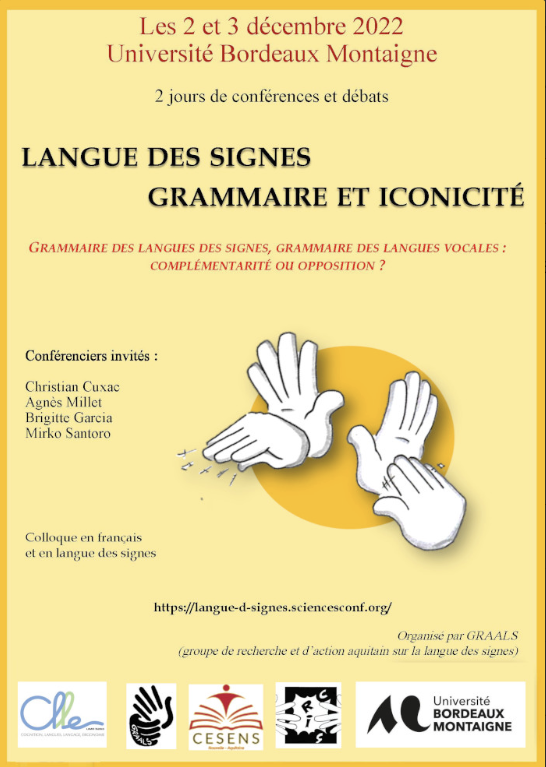 La présentation du colloque est reprise du site internet suivant : https://anae-publication.com/agendas/2-3-decembre-2022-colloque-langue-des-signes-grammaire-et-iconicite/
