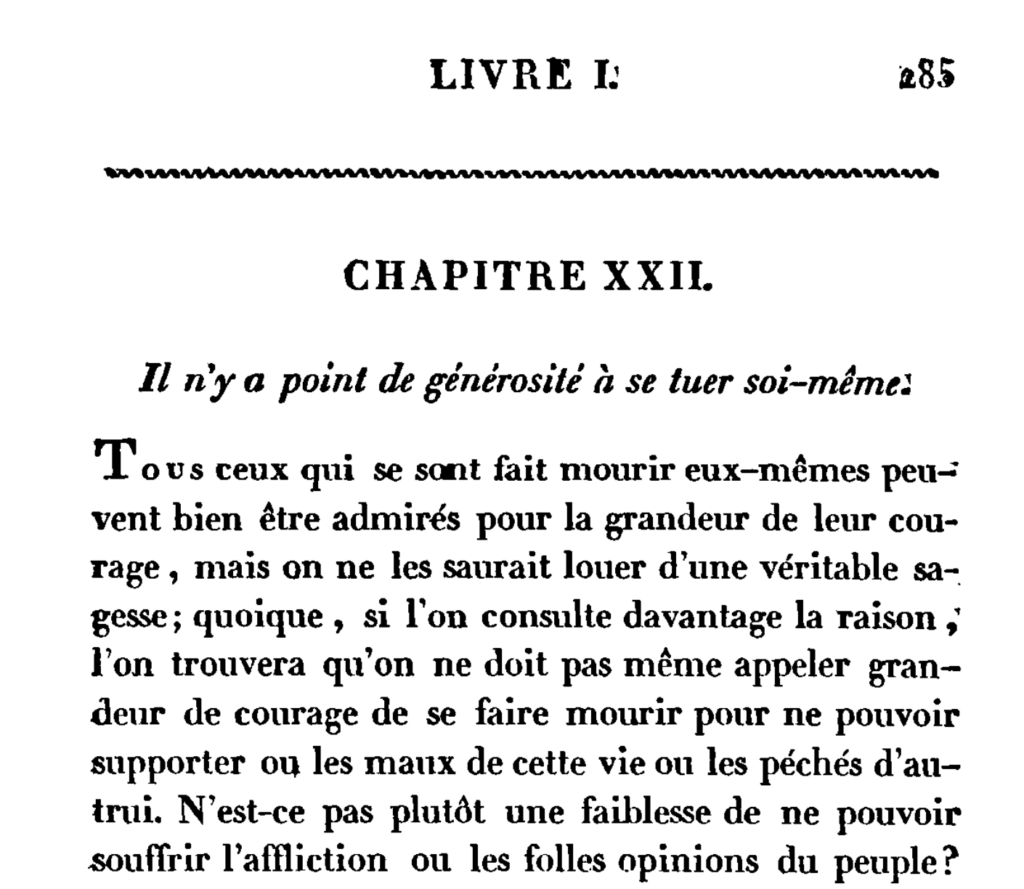 [… Il y a plus de lâcheté que de courage en cette résolution, et qu’elle ne vient pas d’un principe d’honneur qui fait que l’on peut éviter l’infamie, mais d’un sentiment de faiblesse qui porte à se soustraire à l’adversité…] La cité de Dieu, Chapitre XXIII